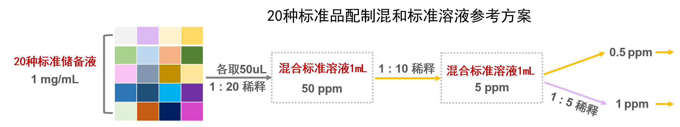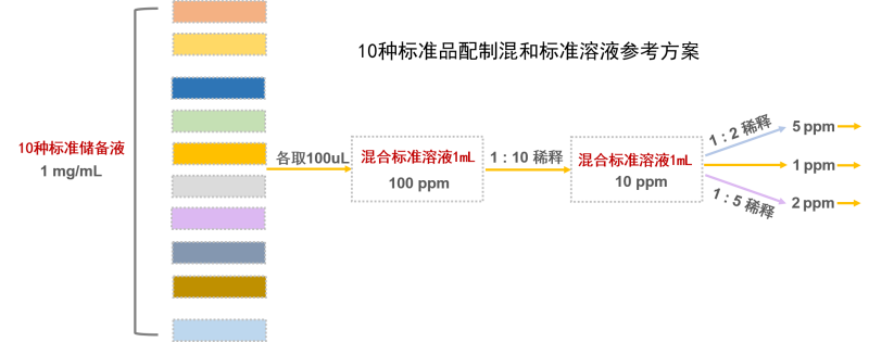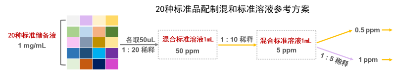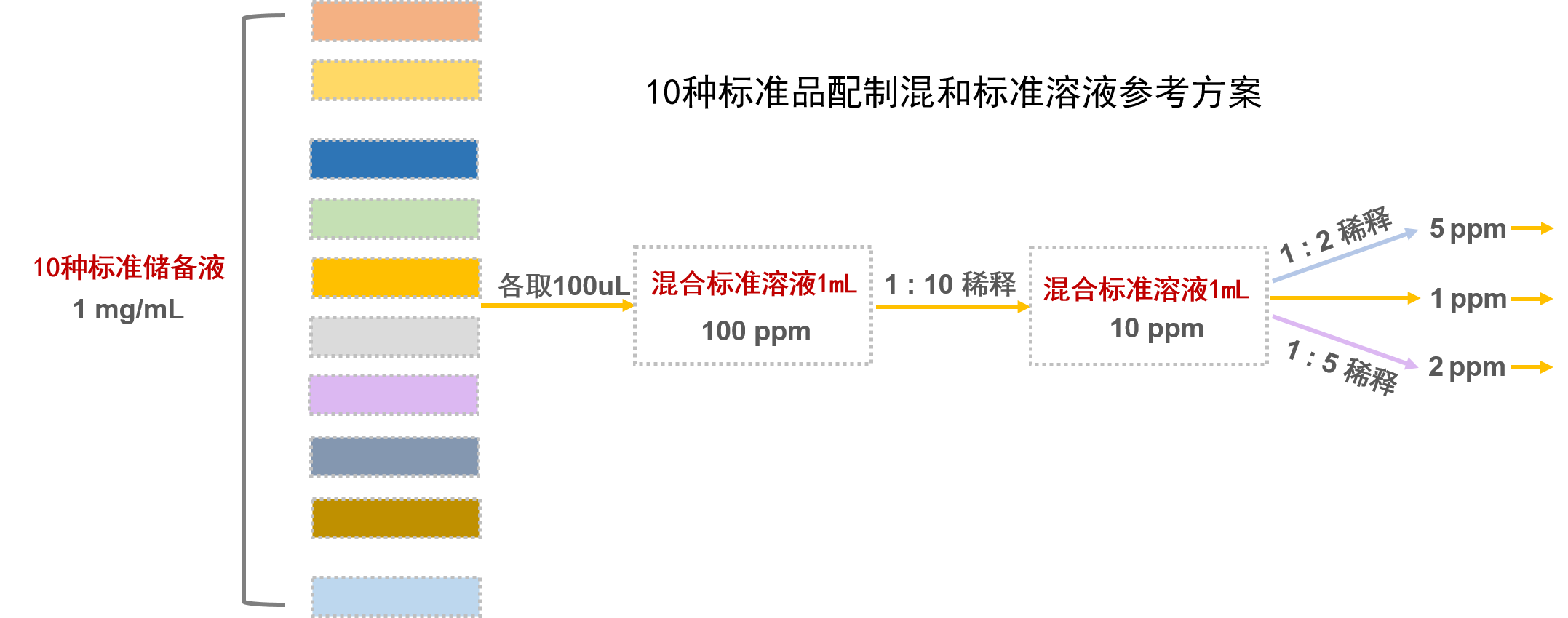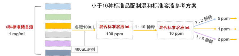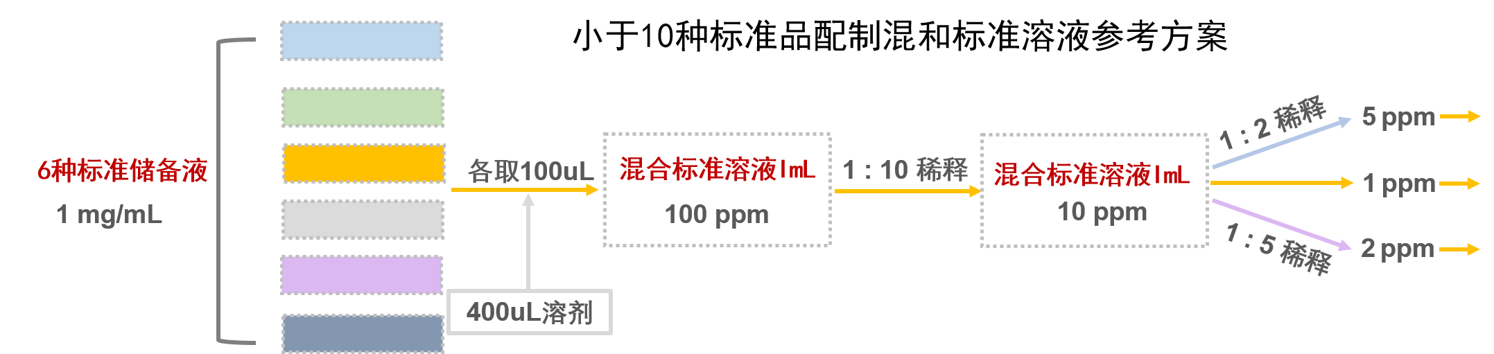 3.混合标准溶液的配制:以1mL 体系为例,如稀释10倍,则各吸取储备液100 uL,溶剂补足到1mL,那么每一个标准物质浓度都被稀释到储备液的10%,得到的混标溶液过0.22 um滤膜后,继续根据需要进行梯度稀释。如果标准品种类超过20个,可把体系放大到2 mL及以上,同时调整每个标准品的加入量,方便整除。