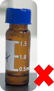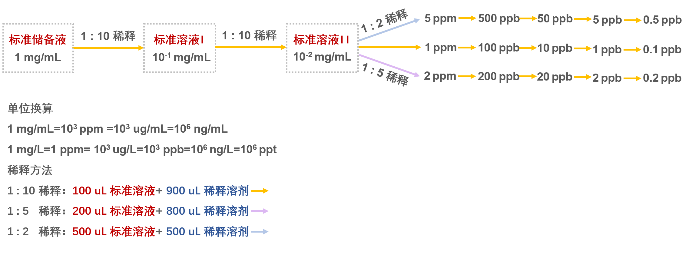 2、标准溶液的配制:根据标准品的包装量选择合适体积、种类的溶剂溶解。如为粉末,选用百万分之一天平,称量1mg左右标准品,加入对应数字体积溶剂(实际称重0.9873 mg,加入0.9873 mL溶剂),即得到1 mg/mL的标准储备液,有效期与标准品性质及储存条件有关,具体可参考标准、文献等资料。标准储备液在检测前按照一定倍数逐级稀释为梯度标准溶液,现用现配。为使标准溶液溶解充分、降低移液枪误差、提高线性系数,尽量选择较大体积(50 uL、100 uL、200 uL等)配置(如图所示供参考)。为保证进样针正常吸取到标品溶液,进样瓶内的液面高度须高于0.5 mL刻度线(如图所示)。标准溶液范围根据样品浓度范围选择,尽量横跨3~4个数量级。如果样品超出线性范围,可将样品稀释到线性范围内。