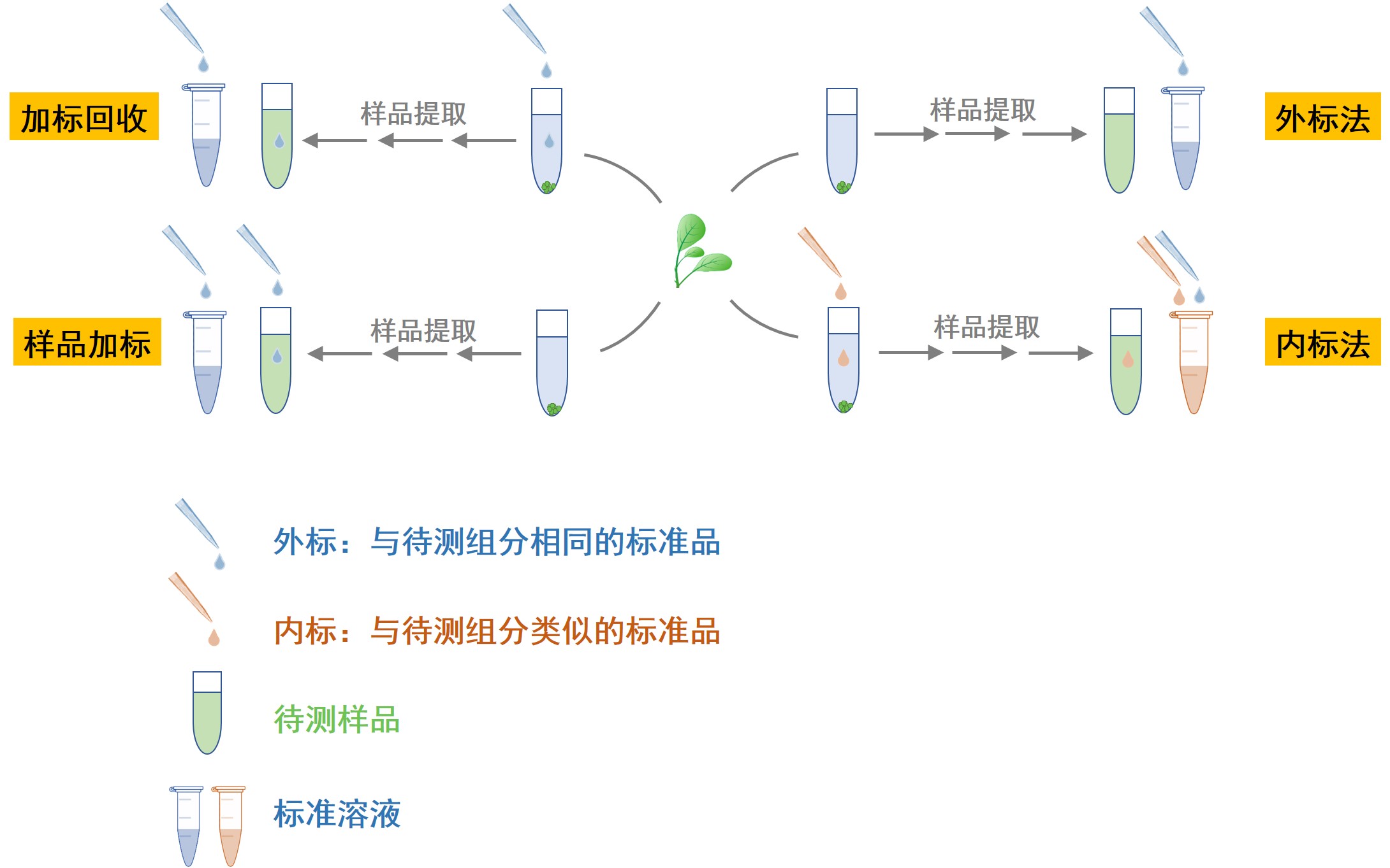 2.加标回收:加标回收和内标法都需要在样品提取前加入标准品,但加入的标准品不同,分别是外标和内标,且最终计算方法不同。加标回收主要目的是计算回收率,反应提取效率,需要设置对照组(未加标样品),计算公式为:回收率 = 100%◊(加标样品待测组分浓度-未加标样品待测组分浓度)÷ 已知加入标准品的理论浓度。该理论浓度计算公式为:已知加入标品理论浓度 = 加入标准品的体积 ◊加入标准品的浓度 ÷ 提取液最终体积。
