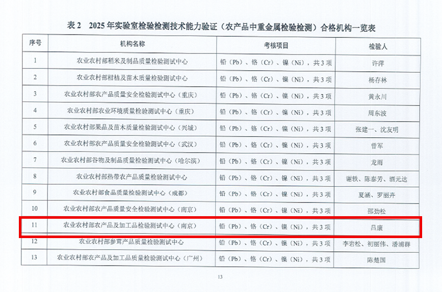 近日,农业农村部农产品及加工品检验测试中心(南京)(简称“部级中心”)收到《关于公布2025年全国农产品质量安全检验检测技术能力验证结果的函》,确认部级中心参加农业农村部农产品质量安全监管司组织的“农产品中农药残留检验检测”、“畜禽产品中兽药和违禁添加物残留检验检测”、“土壤中金属元素检验检测”等6项能力验证均取得了“合格”结果;另外,部级中心还积极参加国家市场监督管理总局组织的“空气和废气中二氧化碳检测”和农业农村部科技发展中心组织的“农业转基因生物成分检测”能力验证,考核结果为“合格”或“满意”。