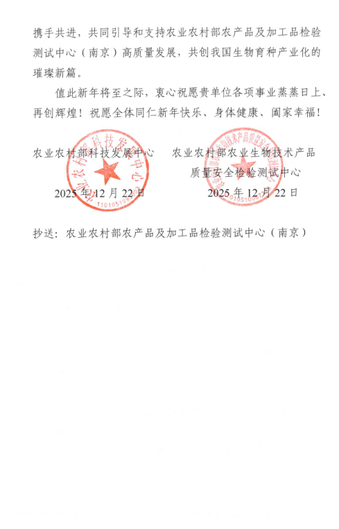 近日,农业农村部科技发展中心专门致信我院,对农业农村部农产品及加工品检验测试中心(南京)(以下简称“部级中心”)积极参加2025年转基因检测各项工作任务表示诚挚感谢,肯定了中心在推动生物育种产业化中的突出作用。