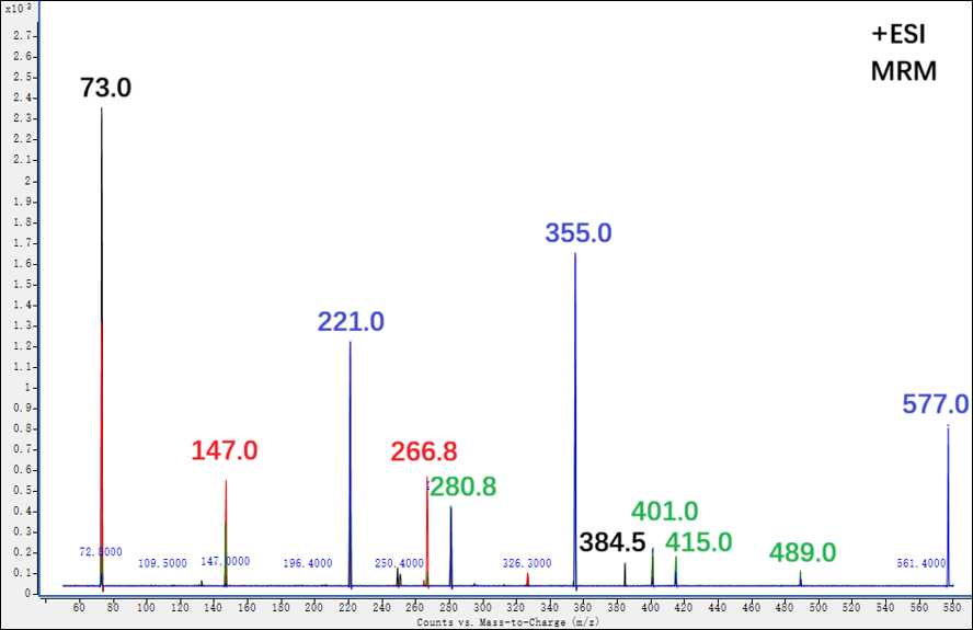 质谱图:模式PI/Positive;仪器Agilent1260-6420 ,负离子模式未检测到子离子碎片。